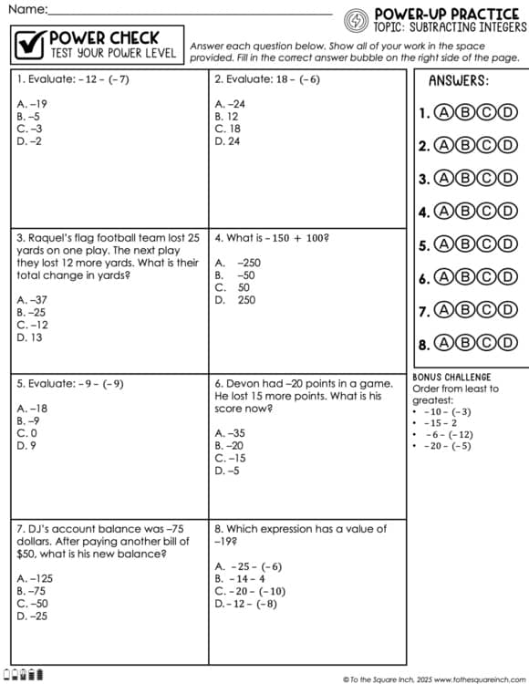 Subtracting Integers – Power Practice Pack gives students engaging, rigorous, and varied practice with subtracting positive and negative numbers. Perfect for classroom practice, math centers, test prep, or interactive notebooks, this resource blends skill review, real-world applications, error analysis, and a fun game-style activity to keep students actively learning.